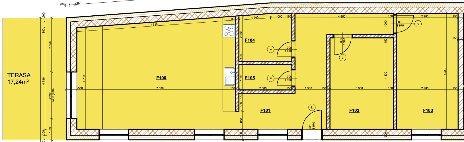 kuchyň a obývací pokoj terasa 5x1,5 m = 7,5 m2